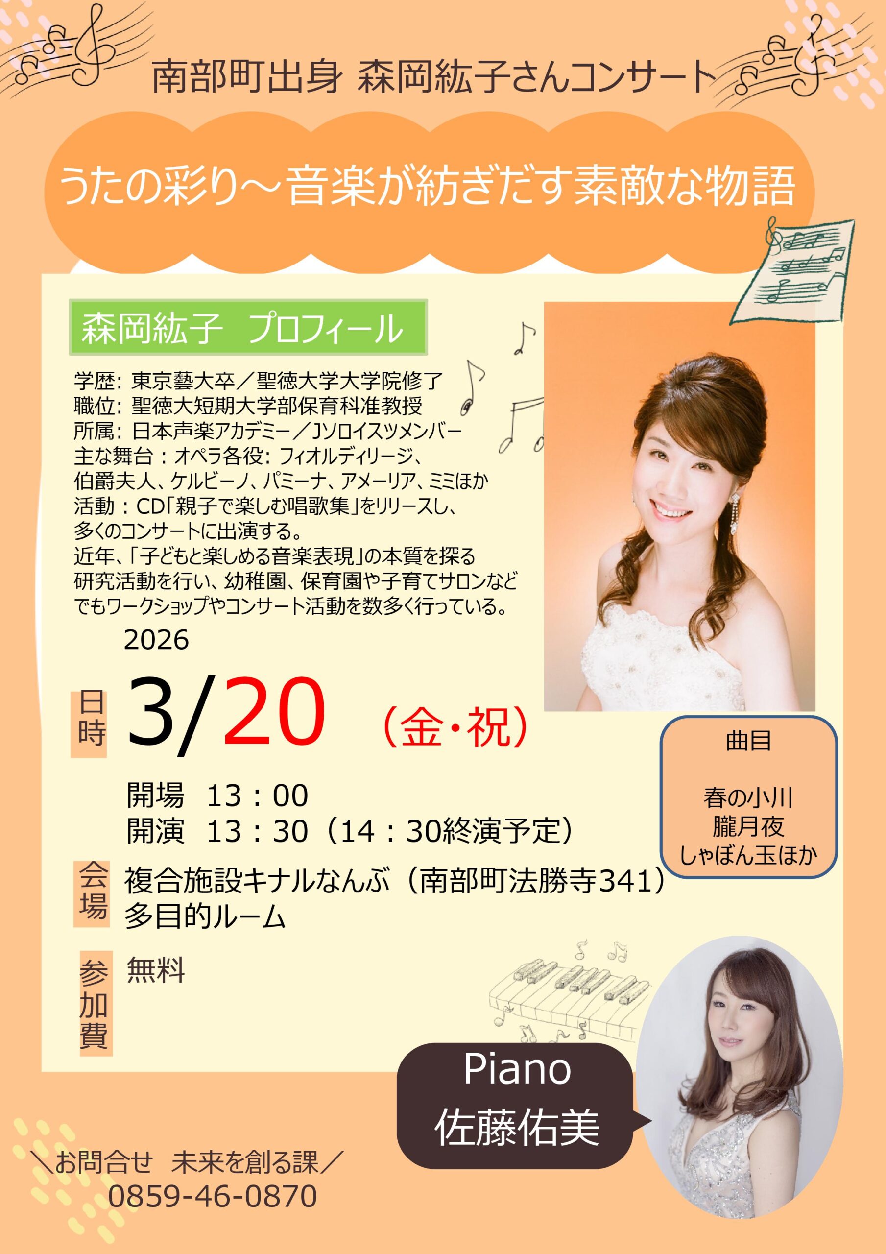 南部町出身の森岡紘子さんによるこどもからおとなまで楽しめるコンサート